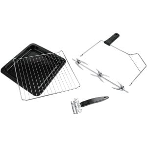 - Inklusive: Drehspieß-Garnitur mit separatem Griff, emailliertes Brat-/Backblech mit separatem Handgriff, verchromter Grillrost, entnehmbares Krümelblech